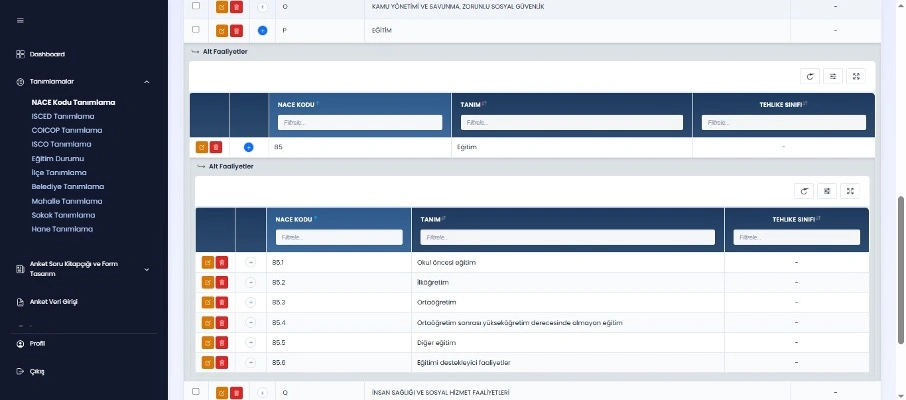 Tanımlar hiyerarşik ağaç yapısı içinde alt faaliyetlerle birlikte görüntülenir. Her seviyede ekleme, düzenleme ve silme yapılabilir; sınıflandırmaların detaylı ve bütüncül yönetimini destekler.