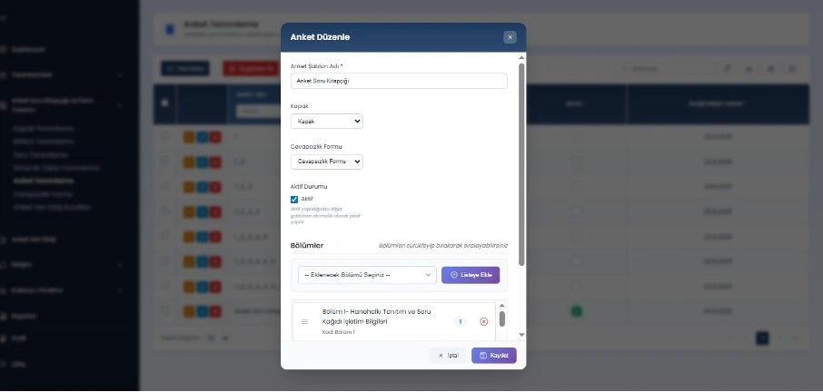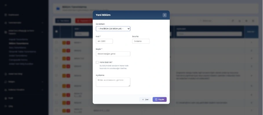 Anket formu bölüm bazlı yapılandırılır ve her bölüm ayrı kaydedilir. Üst bölüm ilişkisi, kod, sıra numarası ve başlık bilgileri ile soru akışı sistematik olarak yönetilir.