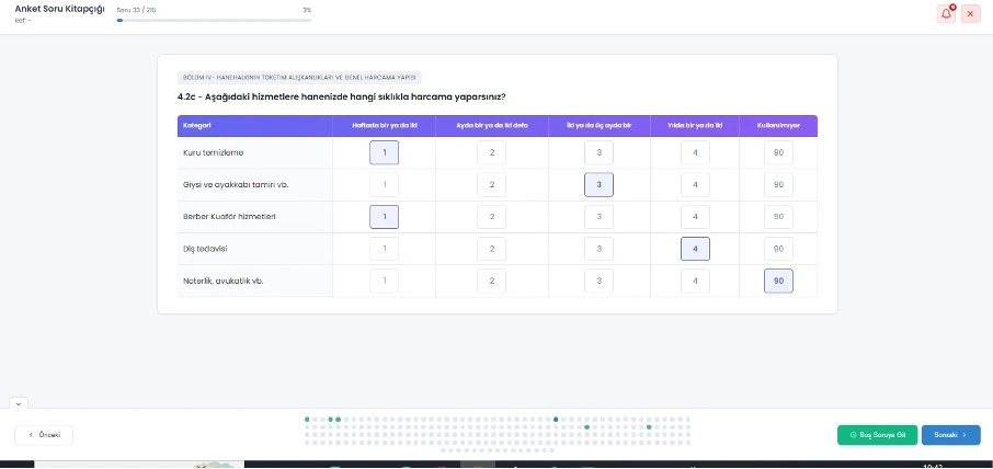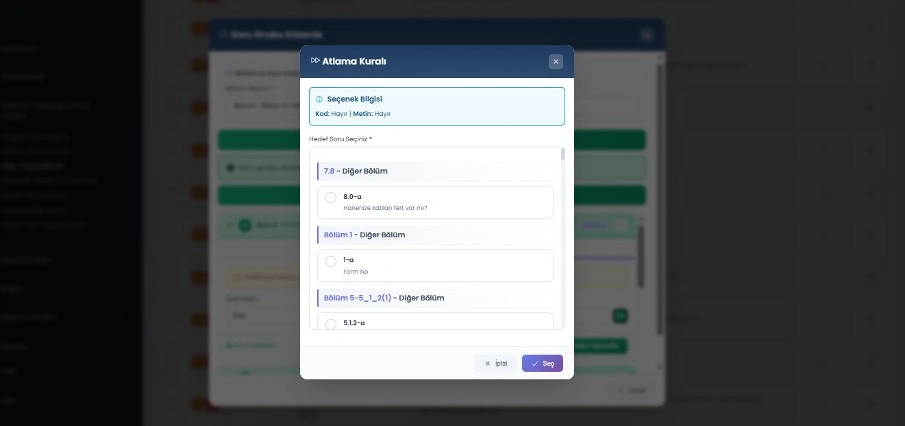 Sorulara bağlı atlama kuralları ile anket akışı dinamik yönetilir. Verilen cevaba göre kullanıcı ilgili soruya veya bölüme yönlendirilir; gereksiz sorular elenir.