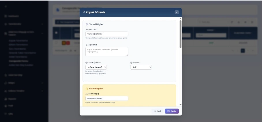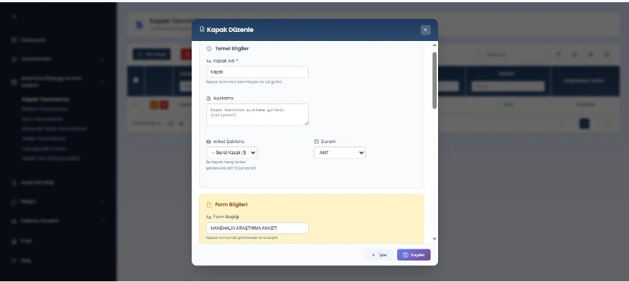 Anketin kapak ekranı bu panelde oluşturulur ve düzenlenir. Kapak adı, açıklama, form başlığı ve durum bilgileri tanımlanır; görsel ve üst bilgi bileşenleri yapılandırılır.