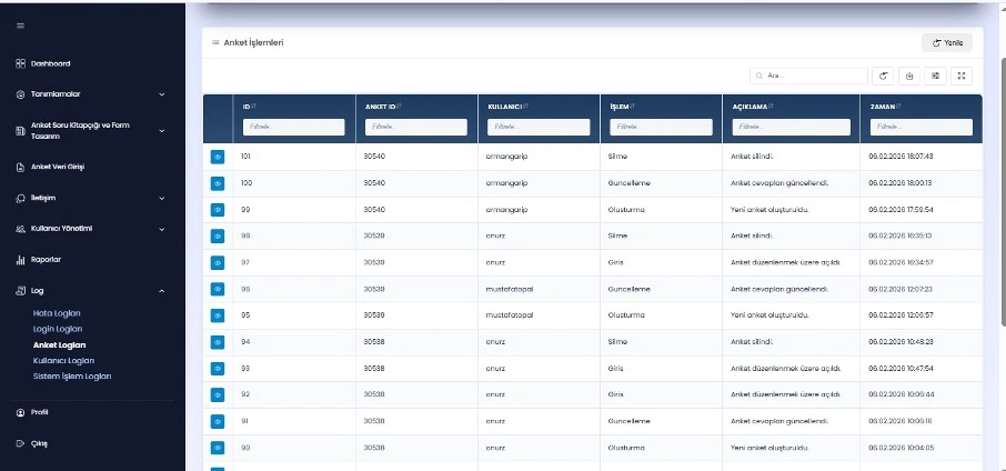 Sistemde gerçekleştirilen işlemler kullanıcı, işlem türü, açıklama ve zaman bilgisiyle loglanır. Anket, kullanıcı, hata ve sistem loglarıyla süreçler denetlenebilir hale gelir.