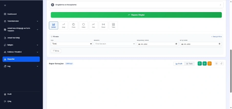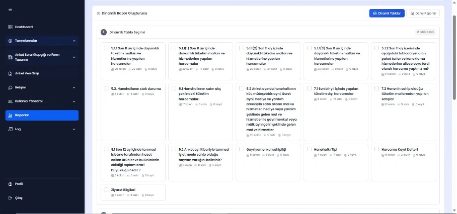 Tanımlanan anket, soru ve tablolar üzerinden dinamik raporlar oluşturulur. Kullanıcılar veri setlerini seçerek farklı kombinasyonlarda rapor üretir, görüntüler ve dışa aktarır.