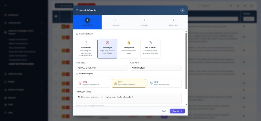 Görünürlük, validasyon, hesaplama ve özel iş kuralları tanımlanır. Her kurala kod/ad verilir; hata, uyarı ve bilgilendirme seviyeleriyle veri giriş doğruluğu güvence altına alınır.