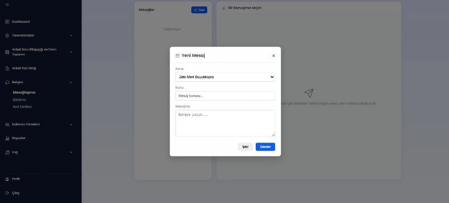 Kullanıcılar sistem içindeki diğer kullanıcılarla doğrudan mesajlaşabilir. Alıcı, konu ve mesaj içeriği tanımlanır; konuşmalar kayıt altına alınır ve takip edilir.