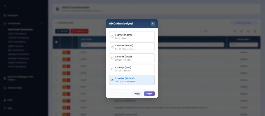 Hiyerarşik kod ve sınıflandırmaların seviye bazlı yönetilmesini sağlar. Kısım, bölüm, grup, sınıf ve alt sınıf geçişleriyle tanımlar düzenlenebilir; çok katmanlı veri modellerinde tutarlılık sağlar.