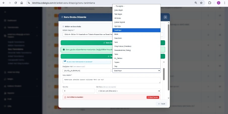 Her soru panel üzerinden tanımlanır ve benzersiz bir değişken adı atanır. Soru tipi, zorunluluk durumu ve hane/fert bazlı uygulanma kurgusu belirlenir.