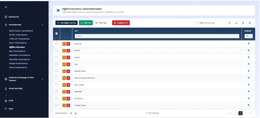 Sistemde kullanılan referans ve kod tanımlarının merkezi yönetimini sağlar. Kullanıcılar tanım ekleyebilir, güncelleyebilir, aktif/pasif durumları değiştirebilir ve toplu işlem yapabilir.