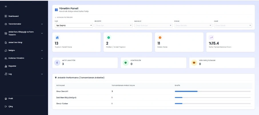 Anket süreçlerinin genel durumunu özetleyen merkezi kontrol panelidir. Toplam hedef hane, tamamlanan-kalan anket sayıları, saha tamamlanma oranı ve aktif anketör bilgileri görüntülenir.