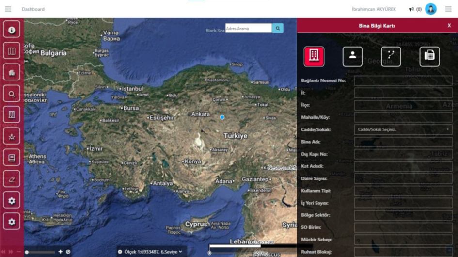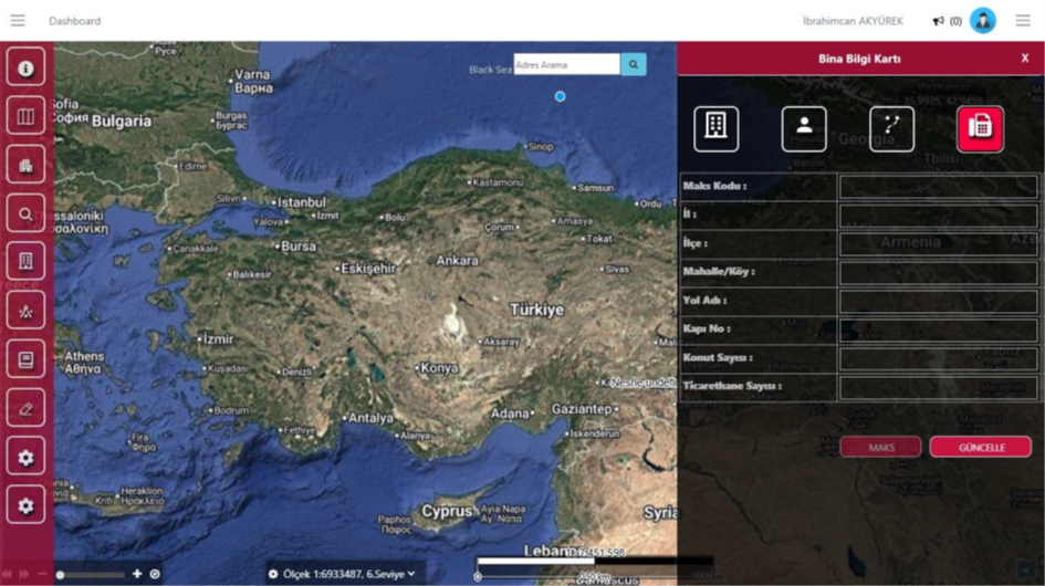 Bu ekran, seçilen binanın MAKS verilerini hızlıca görüntülemek ve güncellemek için kullanılır. İl, ilçe, mahalle, yol adı, kapı numarası, konut ve ticarethane sayısı gibi resmi adres bileşenleri bu sekmede düzenlenebilir. Kullanıcı harita üzerinden bir bina seçtiğinde kartın MAKS sekmesi aktifleşir ve adres doğrulama işlemleri burada yapılır. “Güncelle” butonu ile yapılan değişiklikler anında sisteme işlenir.