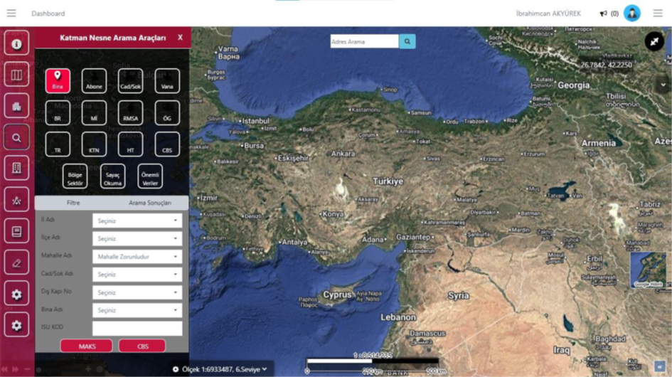 Bu ekran, gaz dağıtım altyapısındaki tüm varlıkların - bina, abone, vana, boru hatları, servis kutuları, sayaçlar ve diğer kritik unsurlar - harita üzerinden ayrıntılı şekilde sorgulanmasını sağlar. Kullanıcı, aramak istediği nesne tipini seçerek il, ilçe, mahalle, cadde, dış kapı numarası veya bina adı gibi kriterlerle filtreleme yapabilir. Arama sonuçları hem listede hem de harita üzerinde anlık olarak görüntülenir. Böylece sahadaki tüm varlıklara hızlı, doğru ve konum bazlı erişim mümkün hale gelir.