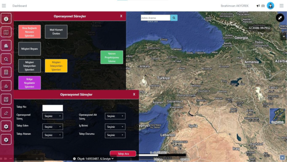 Bu ekran, tüm işletme ve saha işlemlerinin başlatıldığı merkezdir. Kullanıcı buradan bina bağlantı, müşteri beyanı, istasyon ve regülatör işlemleri gibi pek çok operasyon türünü seçip ilgili süreci açabilir. Ayrıca alt kısımdaki arama paneli sayesinde mevcut operasyon taleplerini filtreleyip görüntülemek de mümkündür. Böylece hem yeni işlem başlatma hem de devam eden süreçleri takip etme tek noktadan yönetilir.
