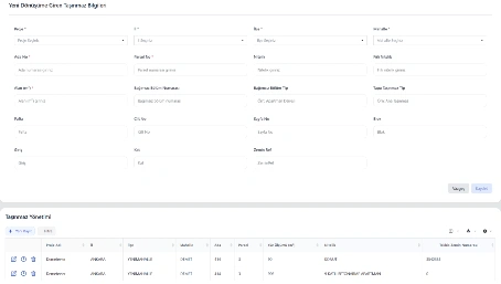 Dönüşüm kapsamına alınan ada, parsel ve bağımsız bölümlere ait tapu ve teknik bilgiler bu ekran üzerinden sisteme kaydedilir. İl, ilçe, mahalle, yüz ölçümü ve nitelik bilgileri tanımlanarak merkezi taşınmaz envanteri oluşturulur.