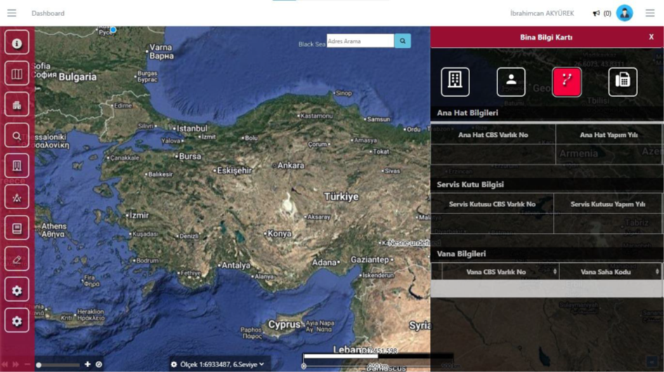 Bu sekme, binaya bağlı ana hat, servis kutusu ve vana gibi tüm saha donanımlarını tek ekranda gösterir. Harita üzerinden bir bina seçildiğinde otomatik açılır ve ilgili altyapı elemanlarının CBS varlık numaraları, yapım yılları ve saha kodları gibi teknik bilgiler burada görüntülenir. Binanın şebekeyle olan fiziksel bağlantısını hızlıca analiz etmek için kullanılır.