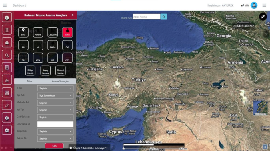 Bu ekran, sahadaki tüm vana varlıklarını hızlıca bulmak için kullanılır. İl ilçe mahalle, yol bilgisi ya da CBS varlık ID’si girilerek ilgili vana harita üzerinde anında işaretlenir. Operasyonel süreçlerde kritik olan vana konumlarına tek adımda ulaşmayı sağlar.